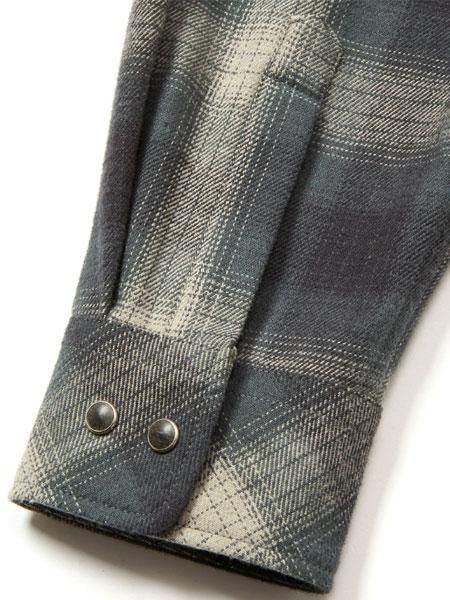 バックヨーク、フラップポケット、パールドットボタンなどのウエスタンディテール。