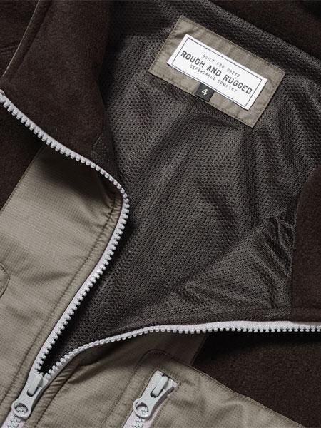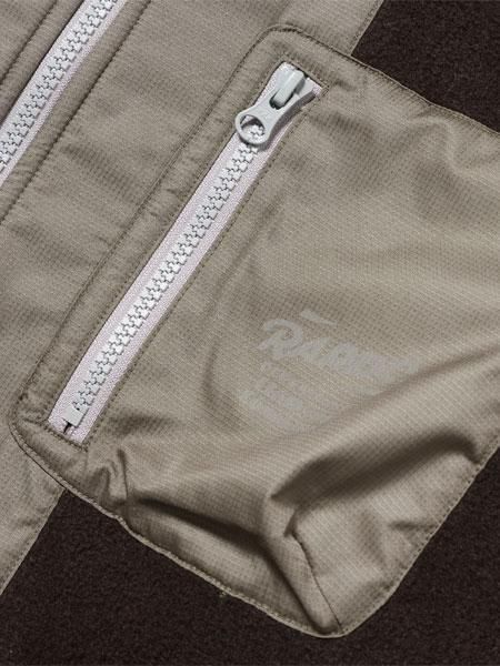 左右胸のポケットにジッパーを縦に配置、フロントジップ部分、首周り、肘から袖にかけてのリップストップ配置。