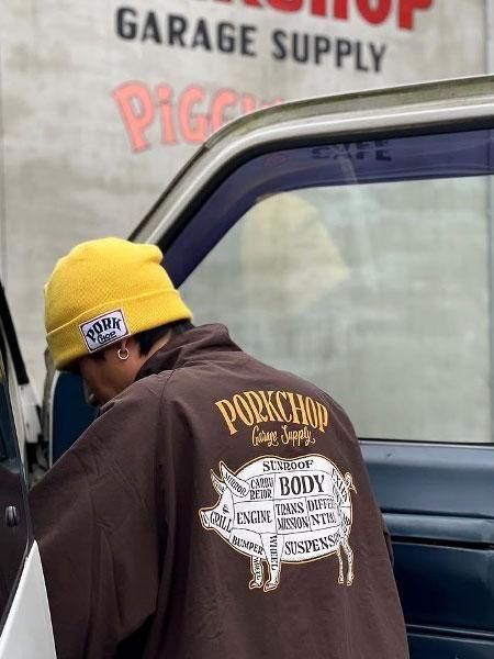 バックにはPORKCHOP GARAGE SUPPLYのメインアイコンである、肉の部位を車のパーツに見立てた豚のグラフィックデザインがプリントで入ります。