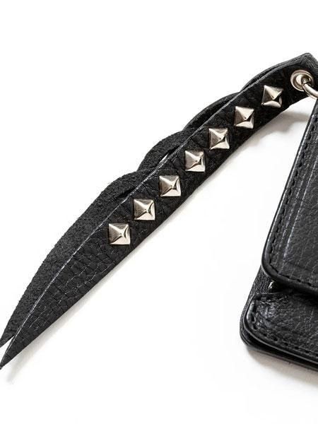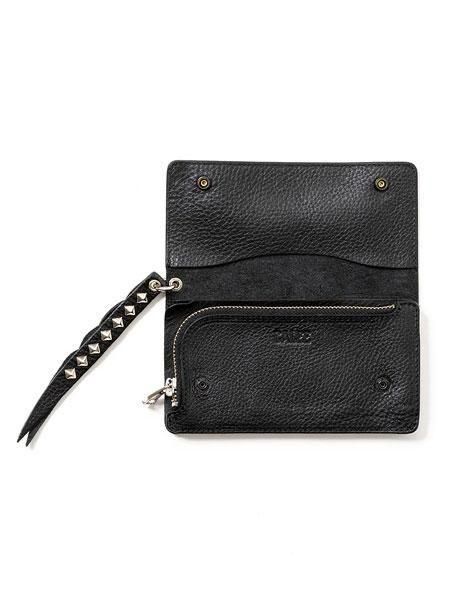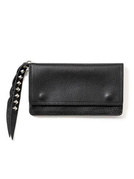 シボ感あるプレーンレザーにスタッズチャームを施して作製されたロングウォレット。