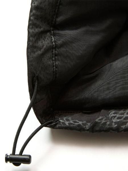 ポリエステル/ナイロンツイルを特殊加工で極限まで密度を高めて製作した生地に、横浜手なっ染(よこはまてなっせん)にてウレタン樹脂に黒顔料を混ぜプリント。